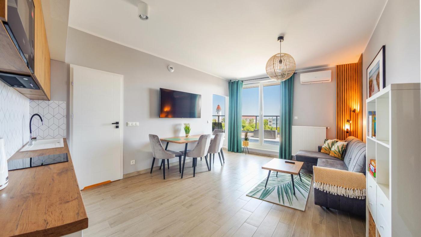 Apartament z 1 sypialnią. This air-conditioned apartment consists of 1 living room, 1 separate bedroom and 1 bathroom with a shower. Guests can make meals in the kitchenette that is equipped with a stovetop, a refrigerator, a dishwasher and kitchenware. This apartment features a coffee machine, a dining area, a flat-screen TV and a balcony. The unit offers 2 beds. Apartament - 4 osobowy. Powierzchnia pokoju ok.: 34 mkw.