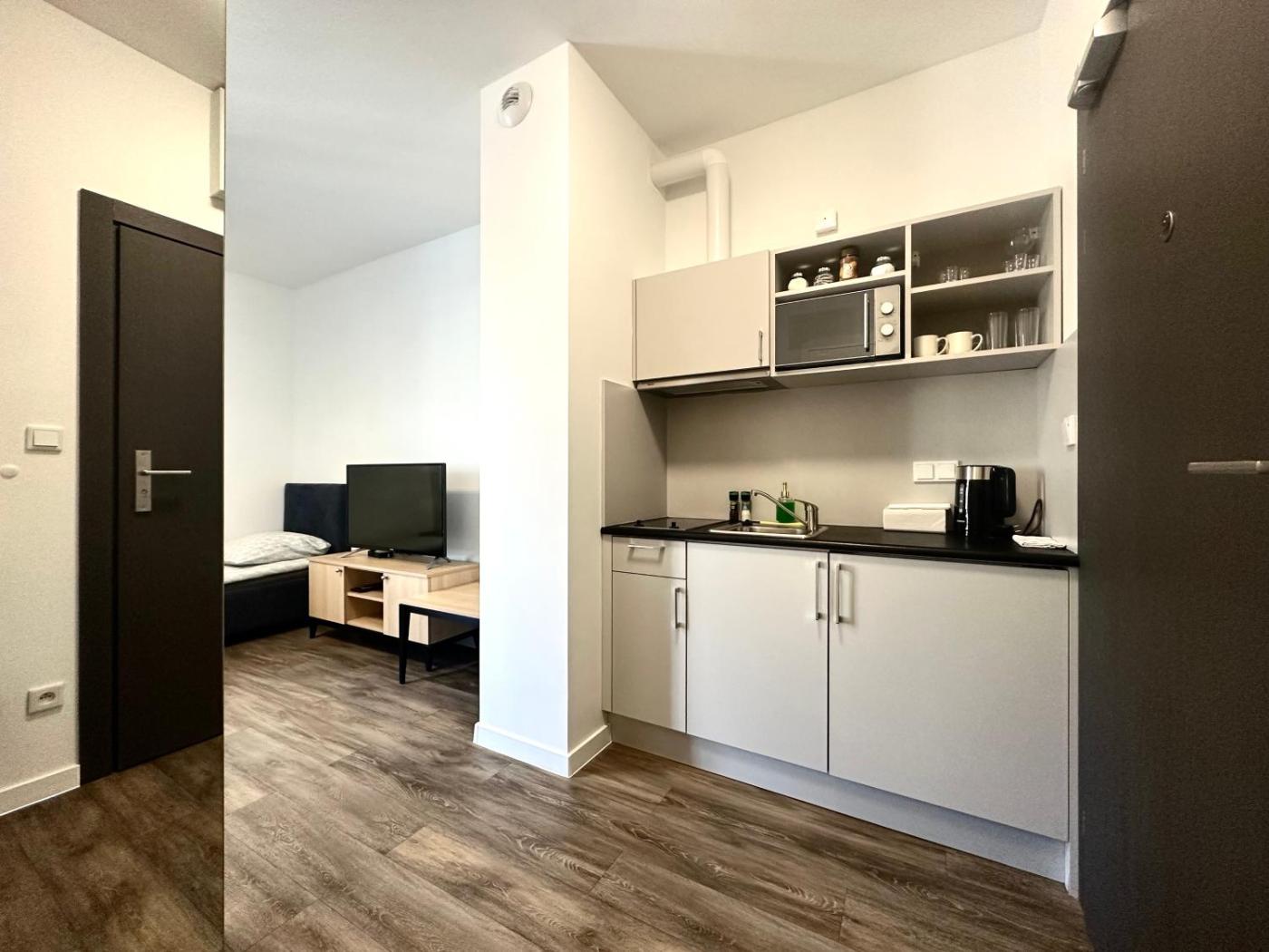 Apartament z 1 sypialnią. This apartment comes with a kitchen, a seating area, 1 separate bedroom and 1 bathroom with a walk-in shower. Guests can make meals in the kitchen that features a stovetop, a refrigerator and kitchenware. The apartment features a washing machine, soundproof walls, a tea and coffee maker, a flat-screen TV, as well as city views. The unit has 1 bed. Apartament - 3 osobowy. Powierzchnia pokoju ok.: 25 mkw.